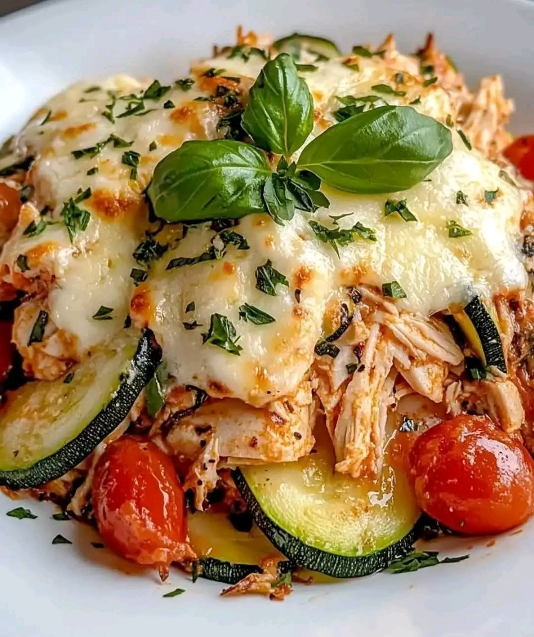 Ingredients: 2 cups cooked chicken, shredded3 medium zucchinis, sliced1 cup cherry tomatoes, halved1 cup shredded mozzarella cheese1/2 cup grated Parmesan ...