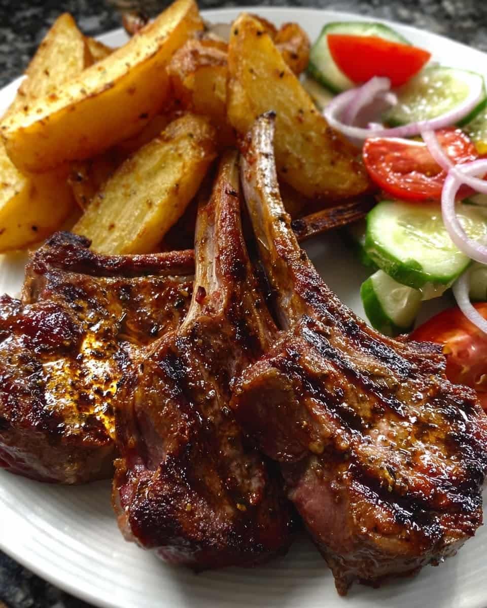 Arrange lamb chops alongside golden wedges and cucumber salad. Spoon any resting juices over the chops for extra flavor. Serve hot for the ultimate family dinner favorite and a guaranteed crowd-pleasing meal.