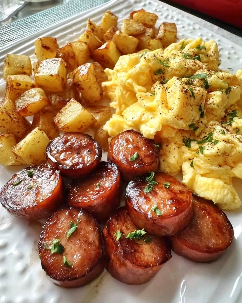 Sizzling Sausages with Creamy Scrambled Eggs & Crispy Roasted Potatoes 🍳🥔